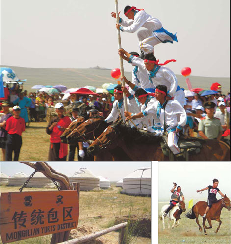 In the dusty plains of the Gegentala grasslands, three horses run side by side at full gallop while six boys form a pyramid on their backs. The crowd roars with approval as they hoist a flag.